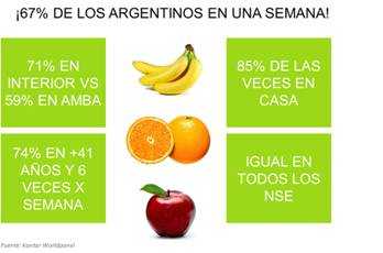 Las frutas son consumidas por el 67% de los argentinos en el transcurso de una semana, teniendo más adeptos en el interior del país y en los individuos de mayor edad, lo que demuestra que la población se ocupan de llevar una vida saludable desde la alimentación, no sólo para cuidar su aspecto físico, sino también para tener un estilo de vida más sano.