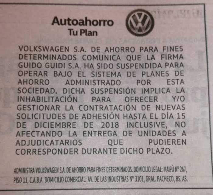 “Volkswagen S.A. de Ahorro para Fines Determinados comunica que la firma Guido Guidi S.A. ha sido suspendida para operar bajo el sistema de planes de ahorro administrado por esta sociedad”, informa la solicitada publicada hoy en los principales diarios.