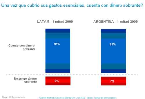 De acuerdo a esta medición, durante la primera mitad del año 2009 en Latinoamérica, el 91% de los consumidores encuestados manifiesta que luego de cubrir los gastos esenciales, le queda algo de dinero sobrante. En el caso de Argentina este porcentaje se ubica en el 93%.