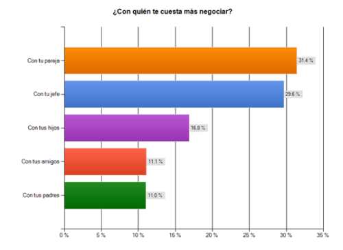 En lo que corresponde a la vida privada de los ejecutivos, los aspectos que les resultan más dificultosos de negociar son: las prioridades en los gastos, el tiempo de presencia en la casa y cómo aplicar disciplina a los niños. Con quien más les cuesta negociar es con sus parejas, sostuvo el 31,4% de los encuestados, seguido por sus superiores con el 29,6%, y con los hijos, el 16,8%. Esta tendencia se da en todos los países en el mismo orden.