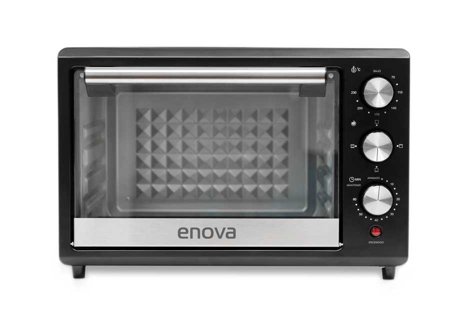 Hornos eléctricos Enova. Con diseño moderno, es el complemento perfecto para la cocina. Con dos modelos, el de capacidad de 25 litros, cuenta con timer, potencia de 1500 W, y un control de temperatura que llega al máximo de 230 grados.