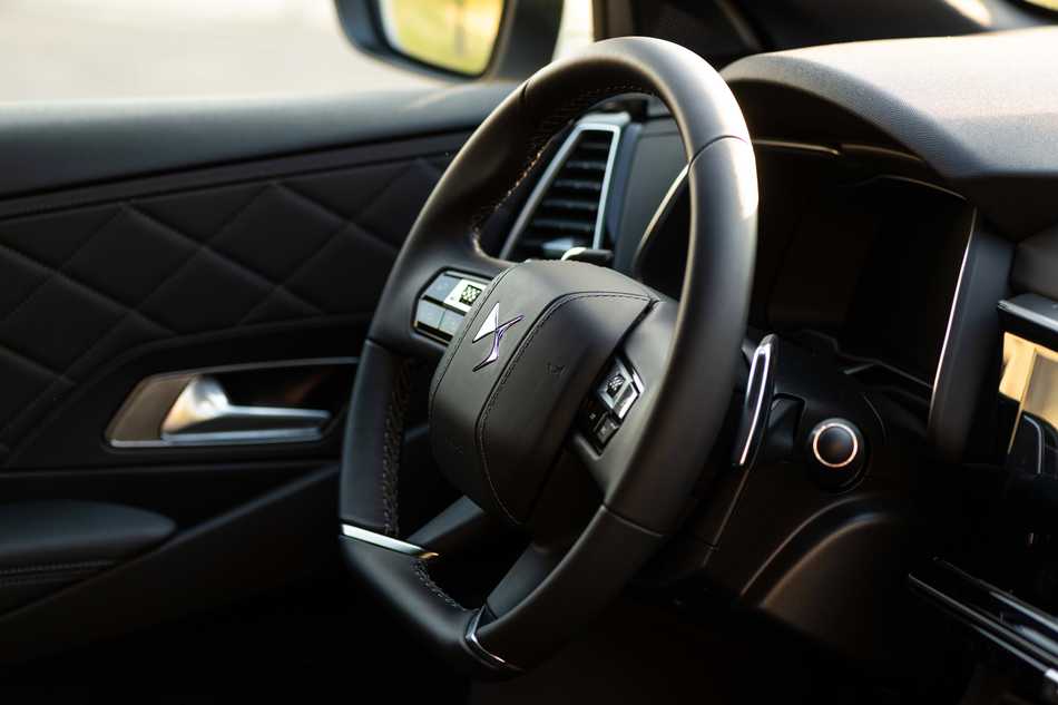Como todos los DS, el volante está revestido de cuero. Y firma esta búsqueda permanente del detalle, las manijas y la parte central del volante (tapa del airbag) también pueden estar revestidas de cuero, una terminación excepcional. Y según la Inspiración elegida la perilla de la pantalla central también puede estar íntegramente engarzada en cristal
