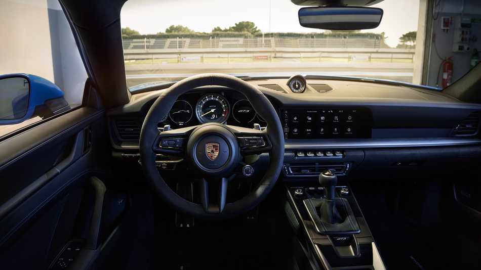 Los genes de competición son evidentes en prácticamente todos los detalles del nuevo 911 GT3. El interior mantiene la línea de los modelos de la actual generación. Un elemento novedoso es la pantalla para pista: al tocar un botón, reduce los paneles digitales situados a izquierda y derecha del cuentarrevoluciones central (que alcanza la marca de las 10.000 rpm), para mostrar la presión de neumáticos, la temperatura y presión de aceite, el nivel de combustible y la temperatura de agua, todo ello esencial para conducir en circuito. También incluye un asistente visual del cambio de marcha, con una barra de color que se va iluminando de izquierda a derecha del cuentarrevoluciones, un elemento más derivado de la competición.