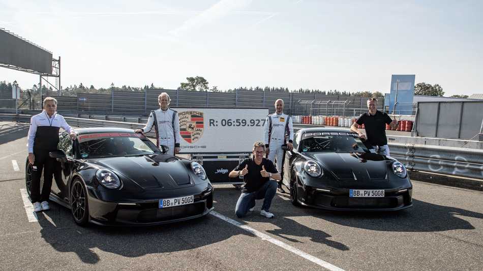 Esta configuración está reservada únicamente para circuito, pues es ahí donde el 911 GT3 puede mostrar todo su potencial. En el mítico Nürburgring Nordschleife, tradicionalmente la referencia para todos los deportivos Porsche, marcó un impresionante récord: durante la fase final de su puesta a punto, el 911 GT3 se convirtió en el primer modelo de producción en serie con motor atmosférico en bajar de la barrera de los siete minutos. El piloto de desarrollo Lars Kern marcó un tiempo de 6:59.927 minutos en una vuelta completa al trazado de 20 kilómetros y 800 metros. En la pista acortada de kilómetros y 600 metros, que anteriormente servía como referencia, el 911 GT3 paró el cronómetro en 6:55.2 minutos. Calzado con los neumáticos opcionales Michelin Pilot Sport Cup 2 R, el nuevo modelo demostró su excelente rendimiento durante varias vueltas, con Jörg Bergmeister, el experto embajador de la marca, al volante. Para Bergmeister, es “con diferencia, el mejor vehículo de producción en serie” que ha conducido en su vida en el ‘Infierno Verde’