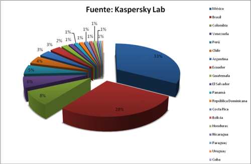 Otro dato interesante es que un 72% de todos los ataques fueron detectados gracias a las tecnologías heurísticas de Kaspersky. Esta cifra es importante ya que son ataques del “día 0” que los criminales cibernéticos preparan especialmente para evadir la detección clásica por ficheros de los anti-virus. Este hecho muestra que los criminales cibernéticos que atacan a los usuarios de América Latina se afanan mucho por tener éxito, pues existe una gran cantidad de dinero que pueden ganar con infectar a cada usuario.