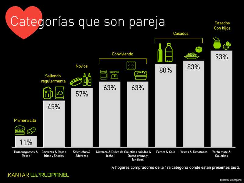 Así, Yerba mate & galletitas es la pareja que está presente en el mayor porcentaje de hogares, por lo que se decidió denominarla: “matrimonio casado con hijos”. Tanto las Pastas & Tomatados como el Fernet & Cola se definen como una pareja de “casados”. En plena “convivencia” se encuentran las Galletitas saladas & quesos crema y fundidos y, Manteca & Dulce de leche.