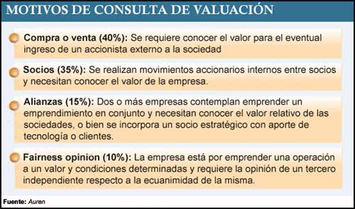 El siguiente cuadro, aportado por la consultora Auren, sintetiza los motivos de consultas referidas a la valuación de una compañía: