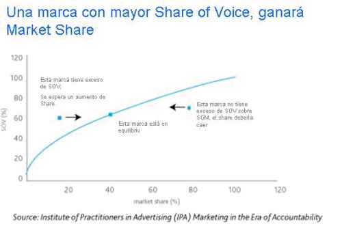 Según el estudio realizado por la unidad Analytic Consulting y su equipo global de Marketing Return of Investment, en el cual fueron analizadas 123 marcas a través de 30 categorías diferentes de publicidad “típica”, una marca cuyo Share of Voice (SOV) es mayor que su Share of Market (SOM) tiene más probabilidades de ganar Market Share. El exceso de share of voice (ESOV = SOV – SOM) es un contribuidor importante para el nivel de crecimiento.