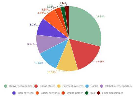 Los ciberdelincuentes a menudo utilizan los nombres de marcas de confianza para llevar a cabo sus actividades delictivas. Se trata de enseñas comerciales, en muchos casos creadas con un gran esfuerzo a lo largo de los años, y que ahora tienen una sólida reputación. El último informe de spam y phishing de Kaspersky revela que las páginas que se hacen pasar por servicios de entrega fueron las que registraron el mayor porcentaje de clics en enlaces maliciosos el año pasado. Un 27,38% de los ataques bloqueados por Kaspersky eran URLs de este tipo. Las tiendas online ocuparon el segundo puesto (15,56%). Sistemas de pago (10,39%) y bancos (10,39%) se alzaron con el tercer y cuarto lugar.