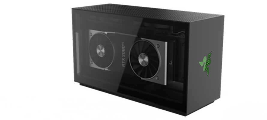 El cuerpo de aluminio del Razer Tomahawk N1 está flanqueado por cristal templado en ambos lados, destacando la GPU montada verticalmente en todo su esplendor, con un diseño de aberturas en la parte superior que mantienen un funcionamiento fresco. En la parte posterior se encuentra un mecanismo deslizable que se abre con mínimo esfuerzo, permitiendo así el rápido acceso a los componentes internos sin necesidad de usar herramientas.