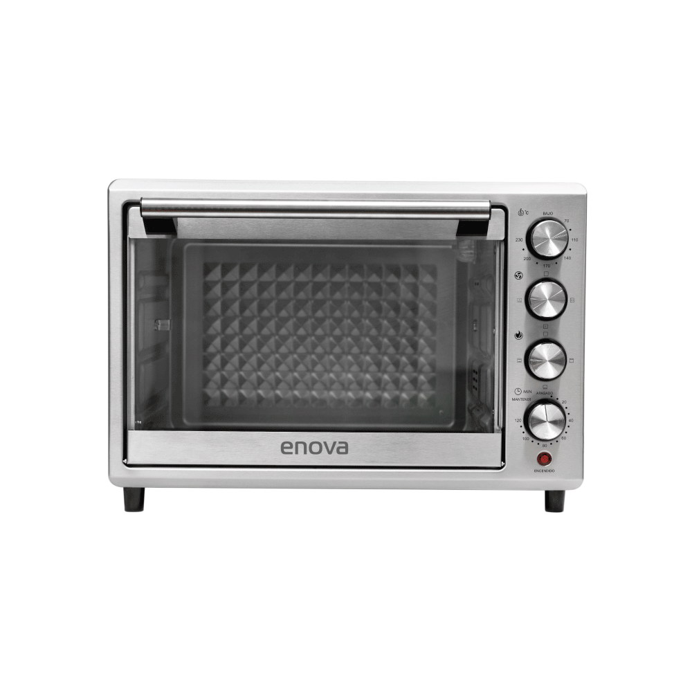 Hornos eléctricos Enova. Con dos modelos, el de capacidad de 25 litros, cuenta con timer de 60 minutos, potencia de 1500 W, un control de temperatura que llega al máximo de 230 grados. El de 35 litros tiene la función de convector, spiedo y cocción, con timer de 0 a 120 minutos; potencia de 1500W, iluminación interna; control de temperatura que llega al máximo de 230 grados. Tanto el modelo de 25 litros como la versión de horno eléctrico Enova de 35 litros, cuenta con tres estantes, placas antideslizantes, su puerta tiene vidrio templado con manija de acero inoxidable; patas antideslizantes, el anclaje y cierre de la puerta es con sistema magnético. Las velas de cocción de este horno son metálicas y brinda posibilidad de cocción superior, inferior y ambos al mismo tiempo.