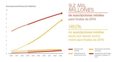 Para el próximo año el número total de suscripciones móviles superará a la población mundial. Producto de un crecimiento sostenido de 7% anual, con 120 millones de adiciones registradas netas en tan solo el primer trimestre de 2014. Las suscripciones de banda ancha móvil también siguen creciendo y llegarán a 7.6 mil millones a finales de 2019, lo que representa más del 80% del total de suscripciones móviles.