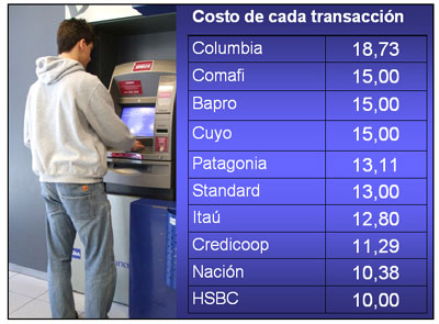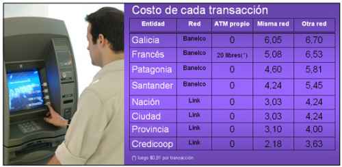 Del cuadro surge que los bancos asociados a la red Banelco son los que cobran las mayores comisiones, que van de los $4,24 a los $6,05 por cada vez que se introduce la tarjeta en un cajero de la propia red. Pero este costo sube sustancialmente si se cambia de operador, pues el piso orilla los $4 y el máximo es de $6,70 por cada vez que se ingresa al sistema.