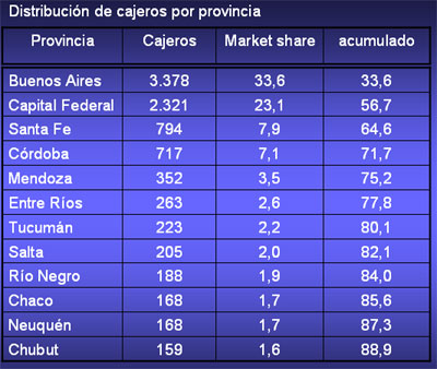 El mapa de cajeros en la Argentina está compuesto por más de 10.000 posiciones, de los cuales la tercera parte se ubica en la provincia de Buenos Aires y una cuarta parte adicional en la Capital Federal.