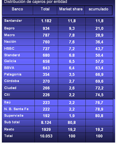 Sobre esos 10.000 cajeros, la mitad está en manos de apenas seis bancos. La entidad con mayor número de terminales es el Santander, con 1.182 posiciones, seguido por el Provincia y el Macro.