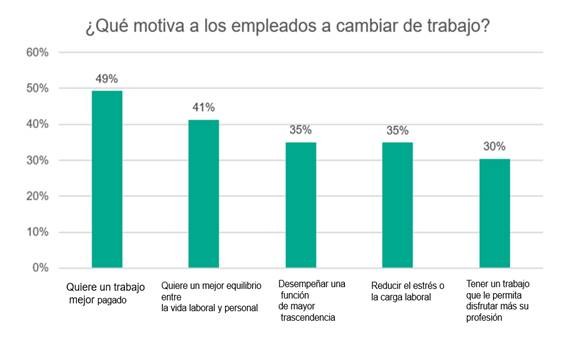 Después del salario y la comodidad personal, un tercio de los encuestados (35%) expuso que otras de las razones para cambiar de empleo son reducir el estrés o la carga laboral. Un número similar expresó desempeñar una función con mayor trascendencia y sentido; otro 30% mencionó dedicarse a un trabajo que les permita disfrutar más su profesión, como otra de las motivaciones para un cambio.