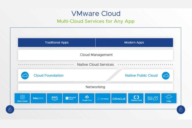 Con VMware Cloud, los usuarios pueden implementar aplicaciones en VMware Cloud Foundation que se ejecuta en Amazon Web Services (AWS), Azure, Google Cloud, IBM Cloud y Oracle Cloud; en VMware Cloud en Dell EMC; y a través de cientos de socios verificados de VMware Cloud Verified. VMware Marketplace suministra a los usuarios acceso a miles de soluciones de desarrolladores de código abierto y soluciones de terceros. Los usuarios de VMware Cloud también pueden implementar y operar a través de nubes públicas nativas y proporcionar a los desarrolladores acceso a todos los servicios nativos de la nube.